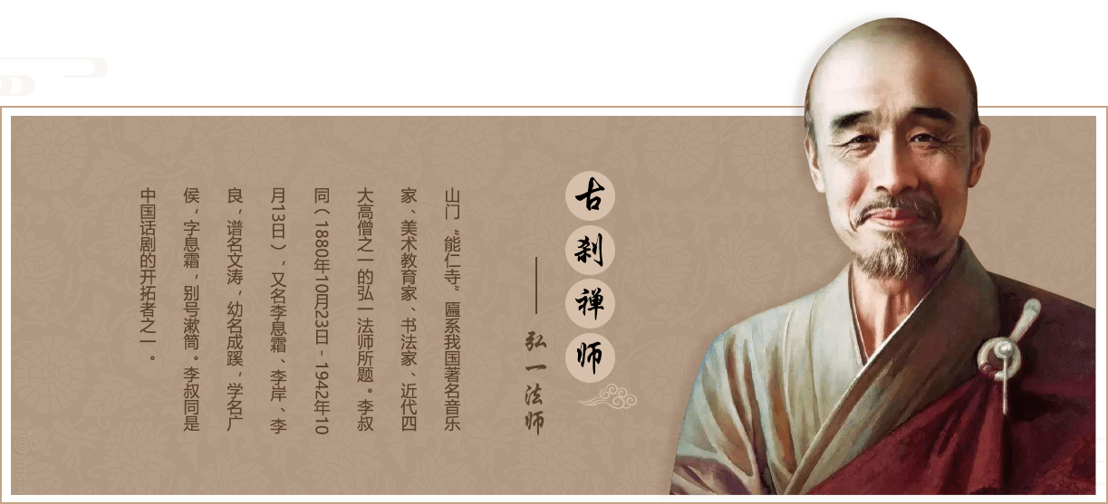 弘一法师也就是李叔同,浙江平湖人,他是著名的音乐家、美术教育家、书法家、戏剧活动家,也是中国话剧的开拓者之一。剃度为僧后,法名“演音”,号“弘一”,被人尊称为“弘一法师”。 “他是一座文化大山。”杭州师范大学“弘一法师”研究中心主任陈星,对他的第一句评价是这样的。“作为研究者,开始时想往上攀登,以探究其风光美景,然而越往上攀,越觉得山峰的奇妙、隽美,以为不是凡人所能攀得上去的。所以,我常常是存有一种仰望的心态。弘一法师绝对是近现代中国文化史的一位绝世伟人。” 有一首近百年前传唱至今的歌,余韵不绝:“长亭外,古道边,芳草碧连天……”创作这首歌的人,就是李叔同。
